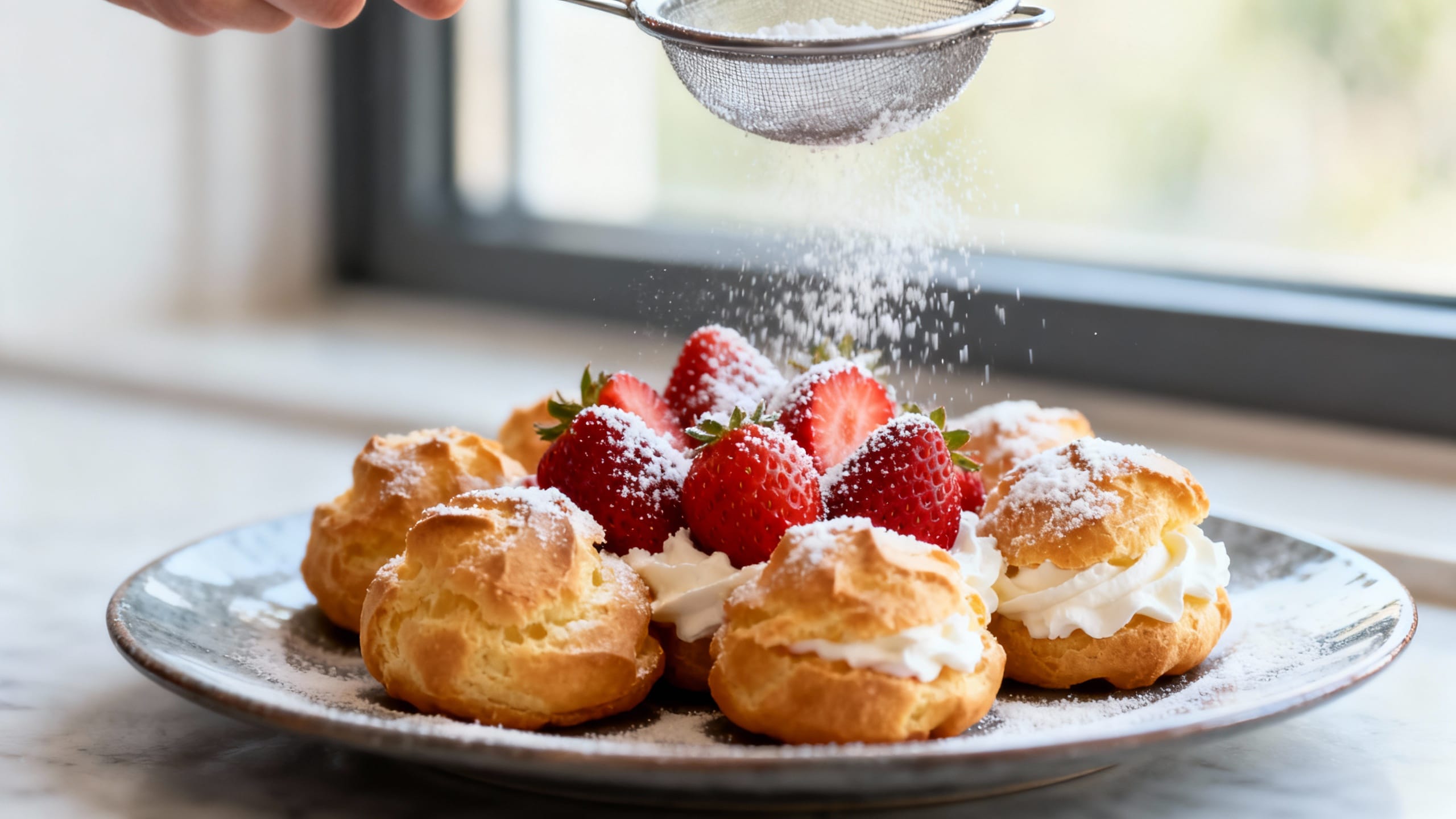 10. Fill and finish. Slice puffs in half or poke a hole in the side. Fill with whipped cream, add strawberries, then pop the tops on. Dust with powdered sugar and serve.