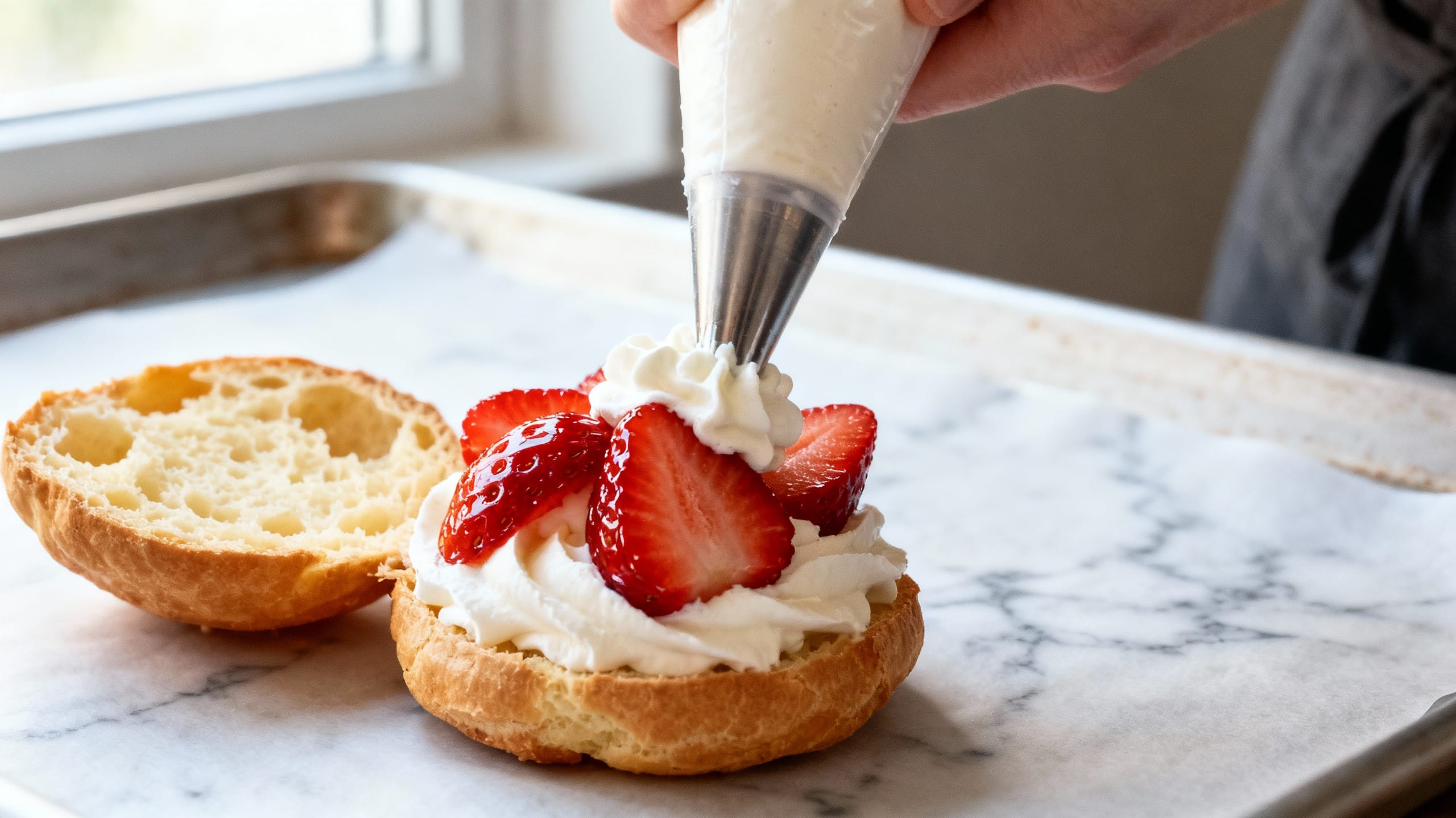 For the cleanest look, use a piping bag. Slice the puffs in half and pipe a swirl of whipped cream on the bottom, then add strawberries. Or poke a small hole in the bottom and pipe inside for a more classic, bakery-style finish.