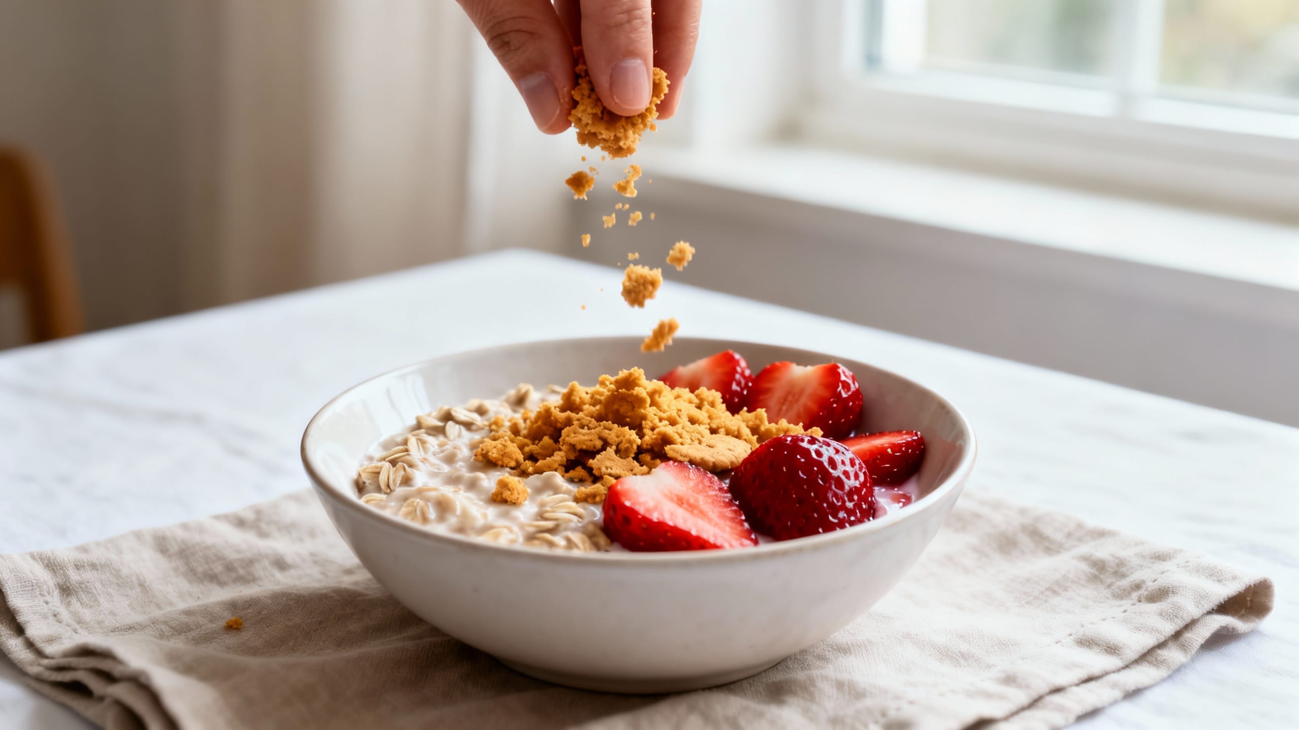 - Chocolate-dipped strawberry twist: Add 1 tsp cocoa powder to the oat base and top with strawberries + crumble for a “dessert for breakfast” upgrade.
