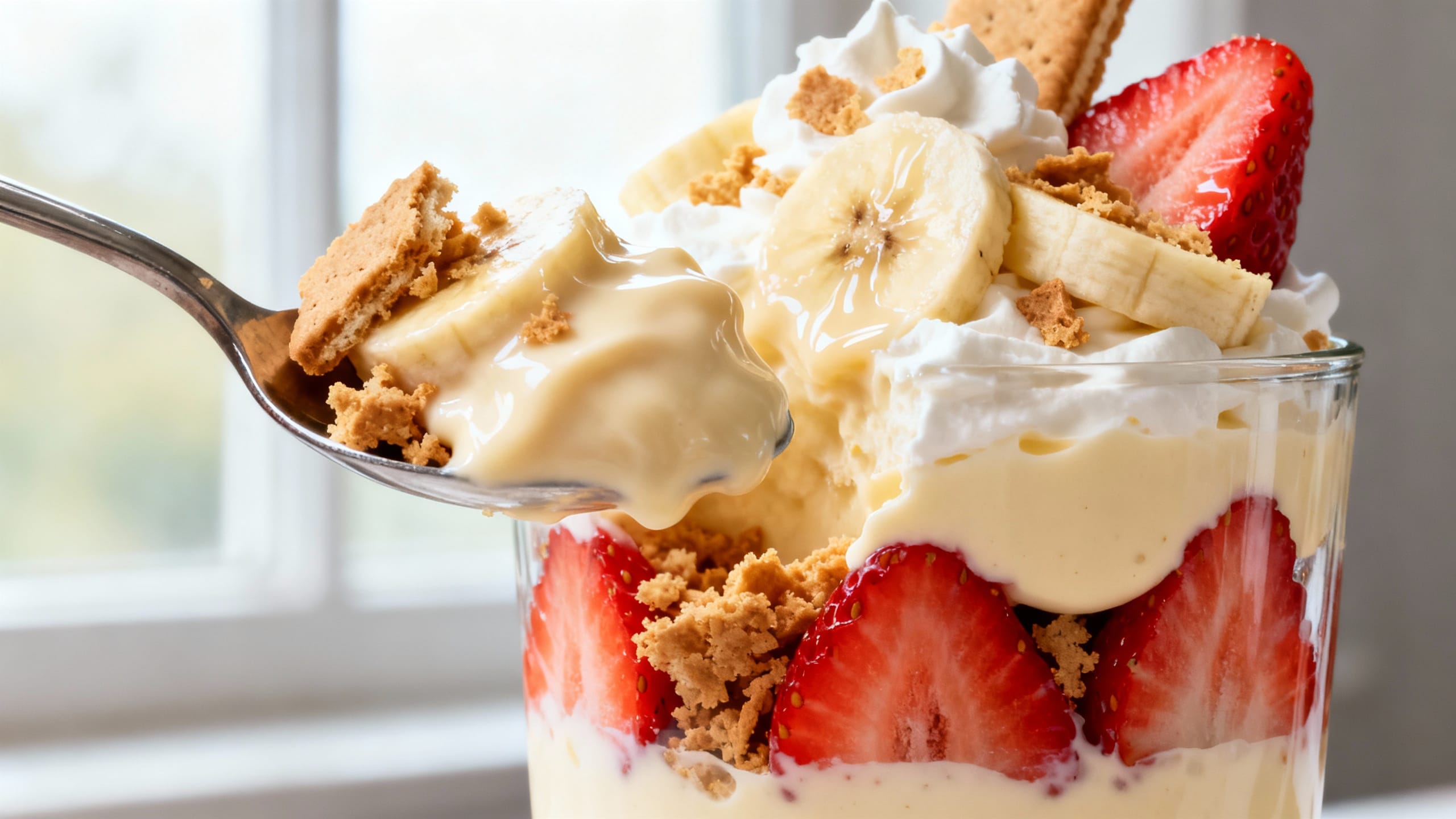 Cover and refrigerate for up to 2 days for best texture and freshest fruit (it’s still safe a bit longer, but the bananas soften and darken). Serve chilled straight from the fridge—this dessert is meant to be cool, creamy, and spoonable. If making ahead for an event, assemble the pudding base early and layer the fruit closer to serving for the brightest look.