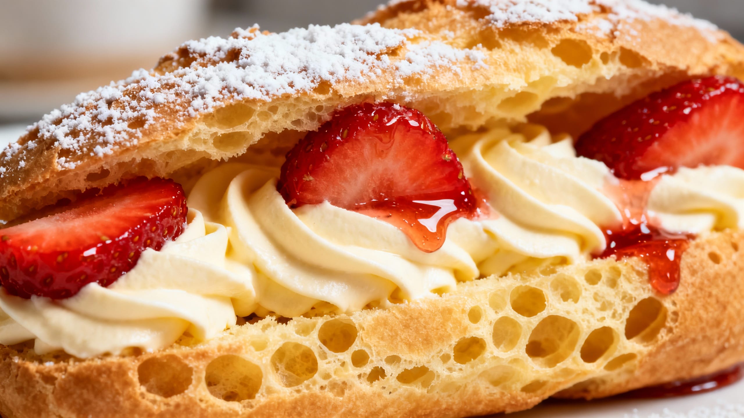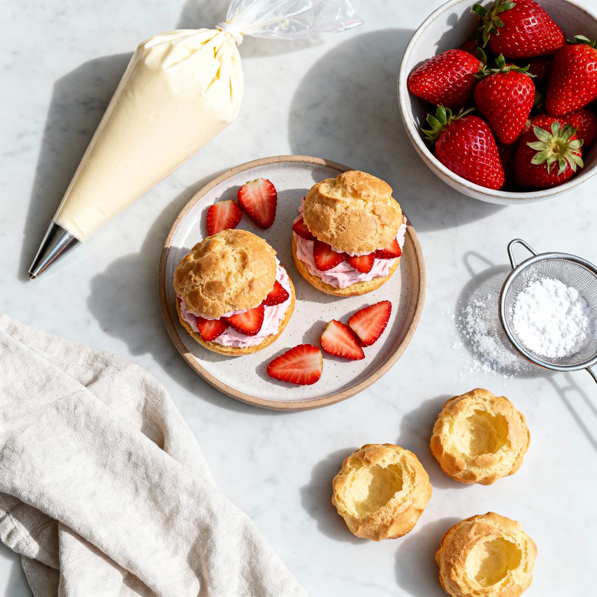 You get that satisfying crackly choux shell with a not-too-sweet, stabilized vanilla cream that holds its shape (no sad puddles), plus fresh strawberries for brightness—aka the ultimate sweet-tart balance that feels fancy without being fussy.