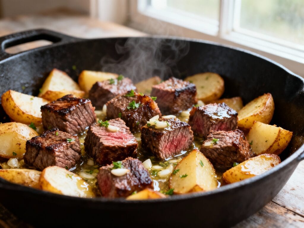 If “steak dinner on a Tuesday” sounds unrealistic, this one-pan situation is about to change your whole weeknight vibe. You get crispy-edged potatoes, juicy steak bites, and a glossy garlic butter sauce that tastes like you tried way harder than you did.