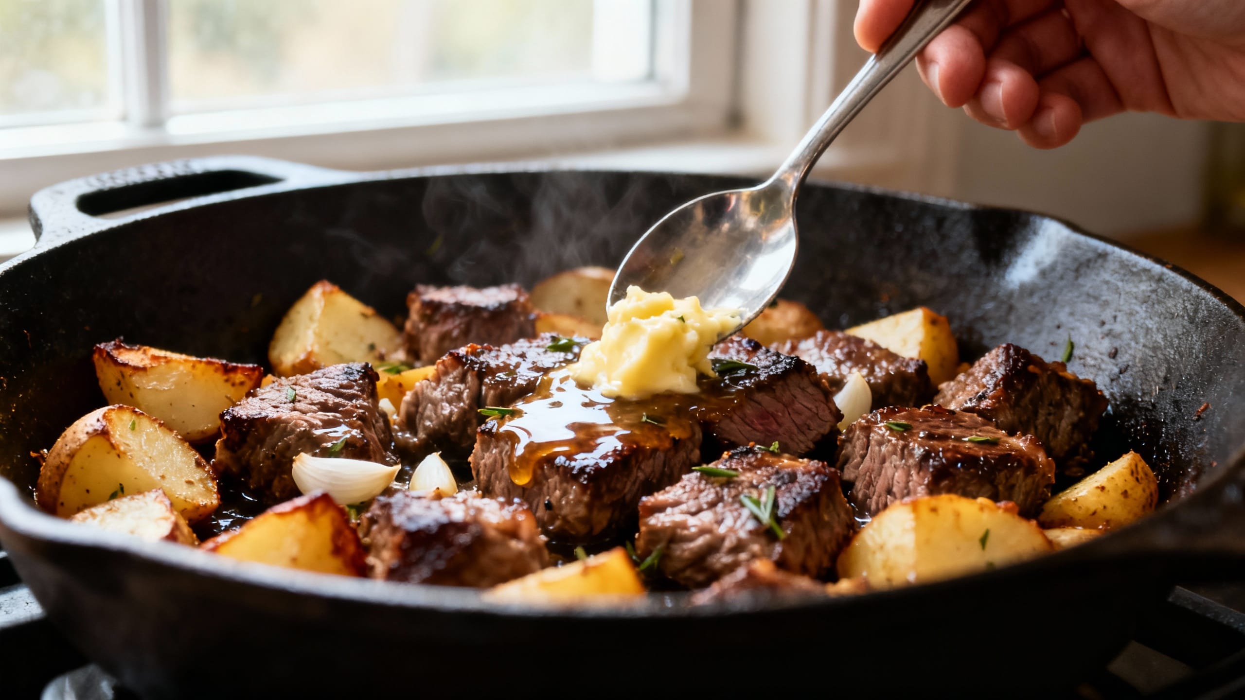 Two things: high heat and short cook time. Sear the bites quickly and pull them as soon as they’re done (they’ll keep cooking a little when tossed with the hot potatoes and butter). Also, add garlic at the end so you’re not stuck cooking longer while it burns.